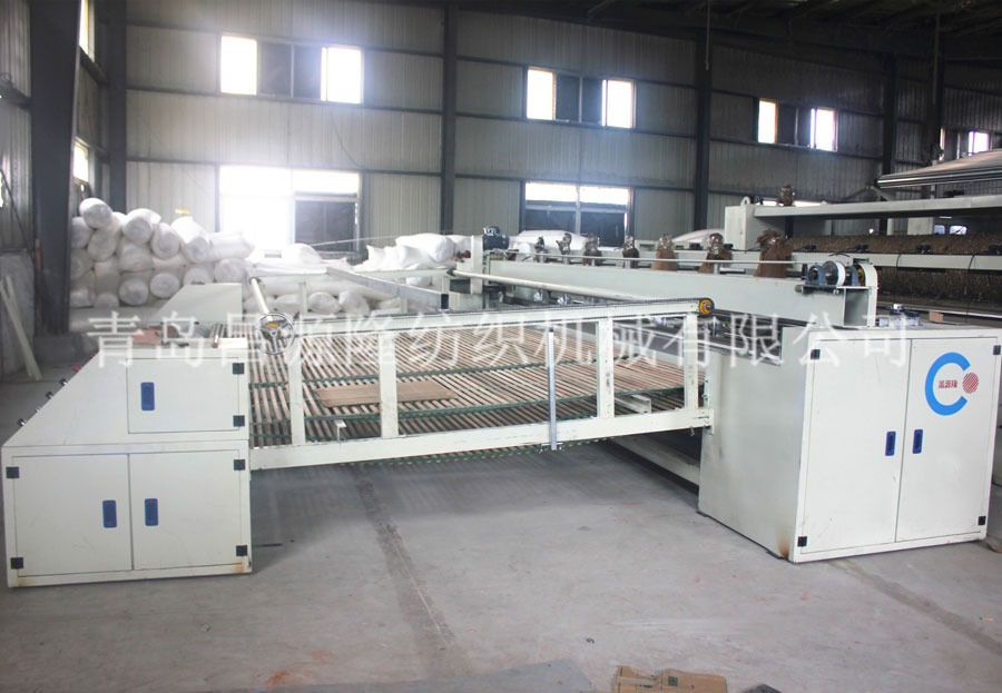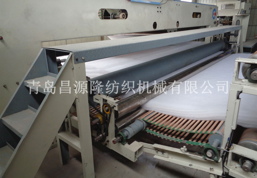 5. CYLPW-2200鋪網機(jī):機架采用6mm鋼板折彎而成,鋪網簾之間加補償電機,減少纖(xiān)網牽伸。往複換向用變頻控製,衝擊力小,能自動緩衝平衡換向,並配有多段速控製。底簾可調節升降,使棉網能按照所需(xū)要的單位(wèi)克重均勻鋪疊到底簾上,供下一道工序使用。斜簾﹑平簾和大車平簾用高檔優質皮簾,底簾(lián)和環簾為木簾子。