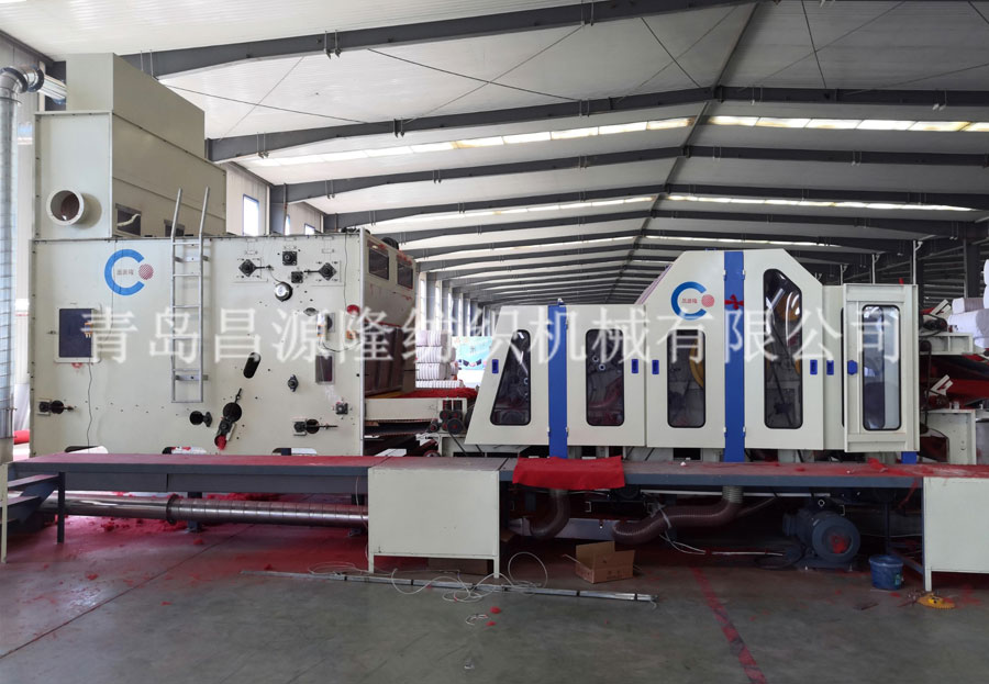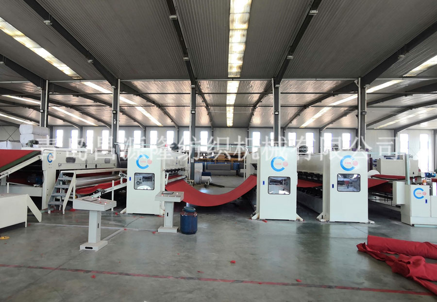 一、一次性地毯生產線工藝流程:開包-開鬆機-振動給(gěi)棉機-梳理機-鋪網機-針刺機-切邊成卷機